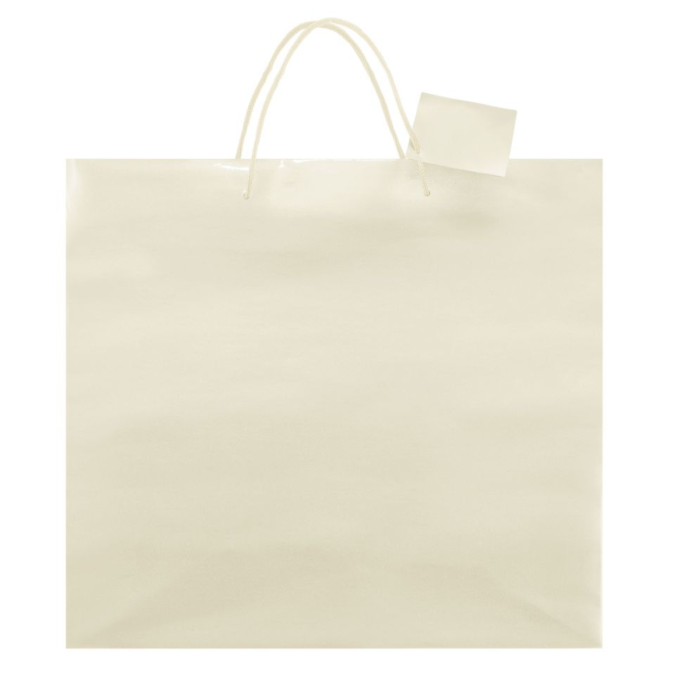 | Tip material: carton plastifiat 210 g/ mp Dimensiuni: 40x36x11 cm (latime x burduf x inaltime) Mâner: șnur crem Culoare: crem |